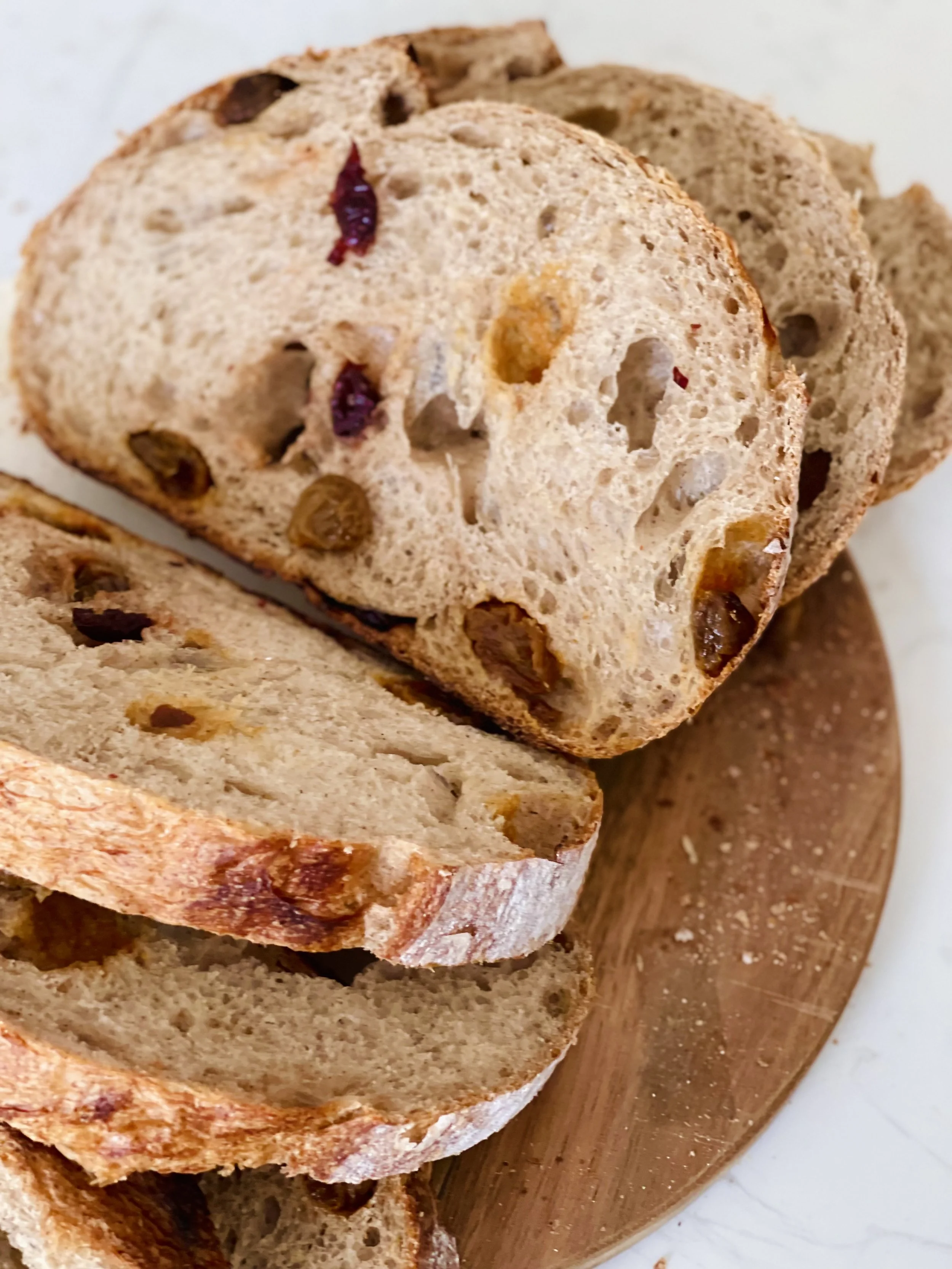 Bánh mì men tự nhiên với nam việt quất và nho khô, so với bánh mì dùng men thường sẽ hơi cứng và dai hơn nhưng đậm vị và ngon hơn